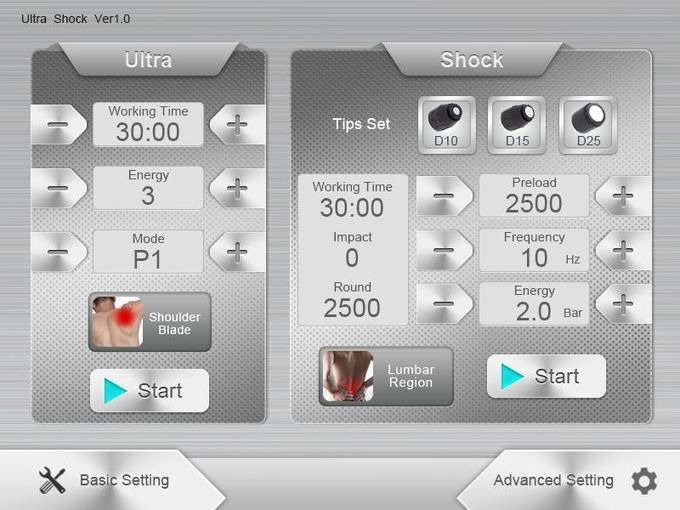 - Điều khiển độc lập: Cả hai chức năng sóng xung kích và siêu âm đều có thể được thiết lập thông số độc lập, giúp các chuyên gia dễ dàng điều chỉnh và sử dụng riêng lẻ hoặc kết hợp tùy theo nhu cầu.