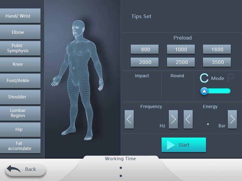 - Tay cầm Sóng xung kích điện từ (Electromagnetic ShockWave): Tay cầm này cung cấp năng lượng điều trị mạnh mẽ từ 5 đến 200 mj và tần số từ 1 đến 16 Hz. Thiết bị đi kèm các đầu phát chuyên dụng, bao gồm các đầu cường độ thấp được thiết kế đặc biệt cho liệu pháp điều trị rối loạn cương dương (ED). Tuổi thọ của đầu đạn lên đến 3 triệu xung, đảm bảo hiệu suất lâu dài.